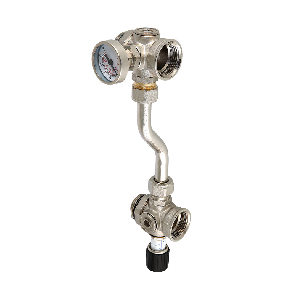 Байпас VT.0667T – проходной (монтируется перед коллекторным узлом), комбинируется с погружным термометром VT 0617. Детали его корпуса выполнены горячим прессованием из латуни марки CW617N, никелированы, перепускная трубка – медная, никелированная. Материал уплотнений – эластомер EPDM. Максимальная рабочая температура теплоносителя – 120 °C, номинальное рабочее давление – 10 бар. Диапазон настройки перепада давлений – 20–60 кПа, пропускная способность Kvs – 4,33 м3/ч.
