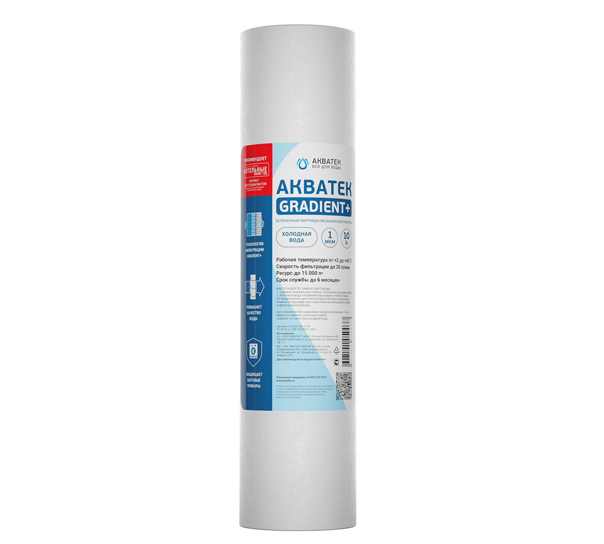 Благодаря равномерной структуре картриджи Акватек GRADIENT+ обладают повышенной производительностью до 20 л/мин и большим ресурсом - до 15000 л (в зависимости от качества воды).