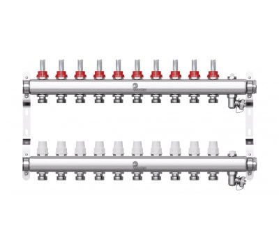 Поставляются с расходомерами в предварительно собранном виде. Укомплектованы кронштейнами для крепления в распределительном шкафу или на стене, воздухоотводчиками для удаления воздуха и дренажными кранами для операций заполнения/слива системы. На подающем коллекторе установлены регуляторы расхода, на коллекторе обратки установлены запорные клапаны.