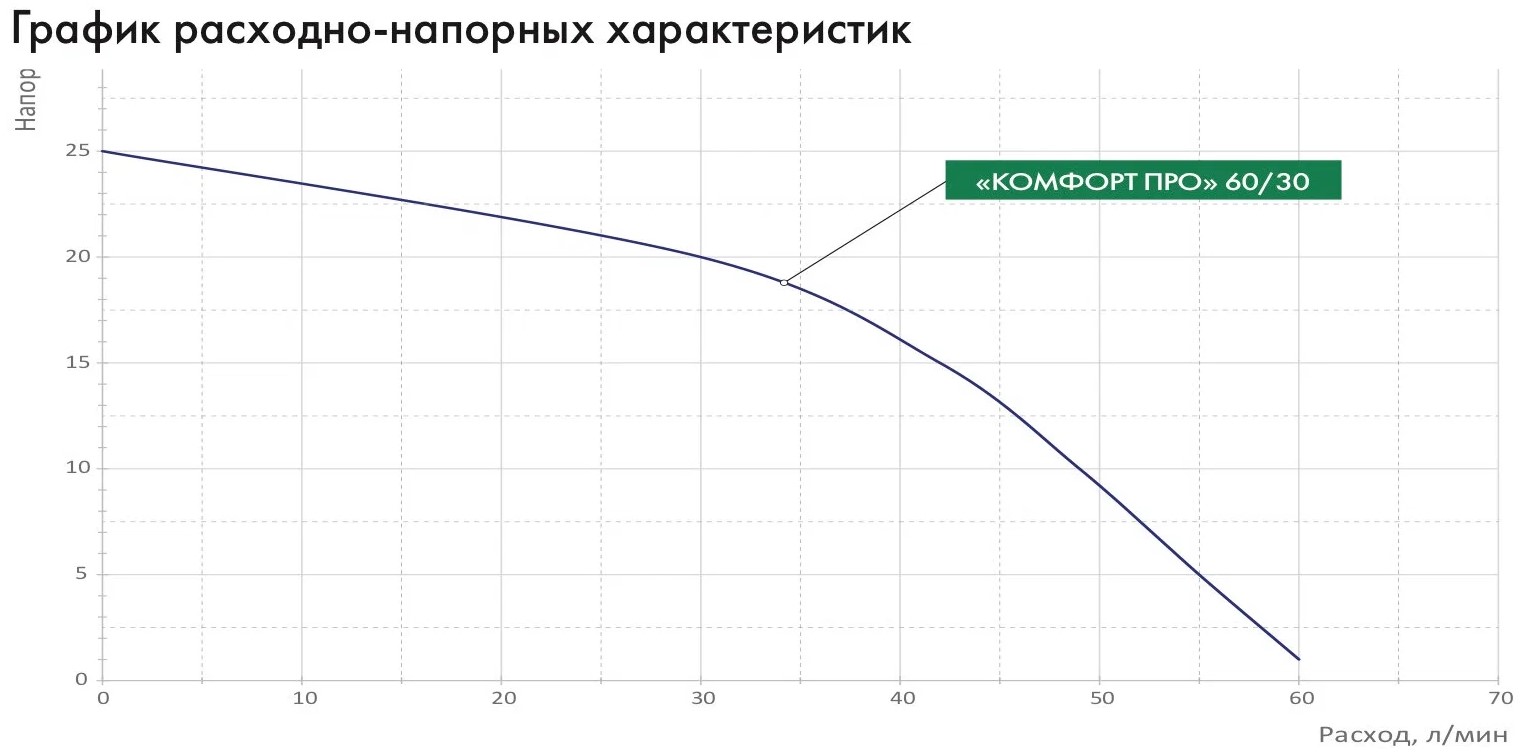 Расходно-напорные характеристики насосов-автоматов зафиксированы в названии с помощью буквенно-цифрового индекса. В названии модели «КОМФОРТ ПРО» 60/30: