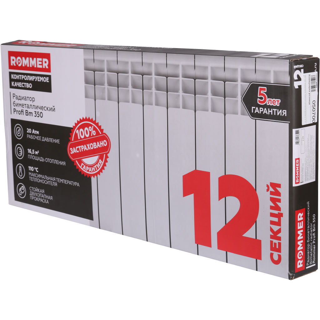 Уникальность биметаллического обогревателя Rommer Profi 350/12 заключается в том, что для его изготовления используют два разных типа металла — алюминий и сталь. Благодаря своим эксплуатационным характеристикам, которые отлично дополняют друг друга, эти металлы обеспечивают отличное качество готовых изделий. Алюминий, например, обладает неплохой теплопроводностью, а сталь способна выдерживать высокое давление внутри системы.