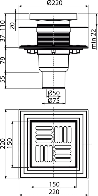 Трап 150/150/50/75 верт. ALCAPLAST